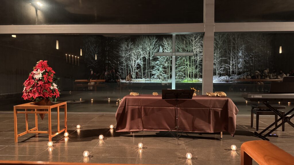 夜になると、水の上の十字架や奥の木々がライトアップされ、