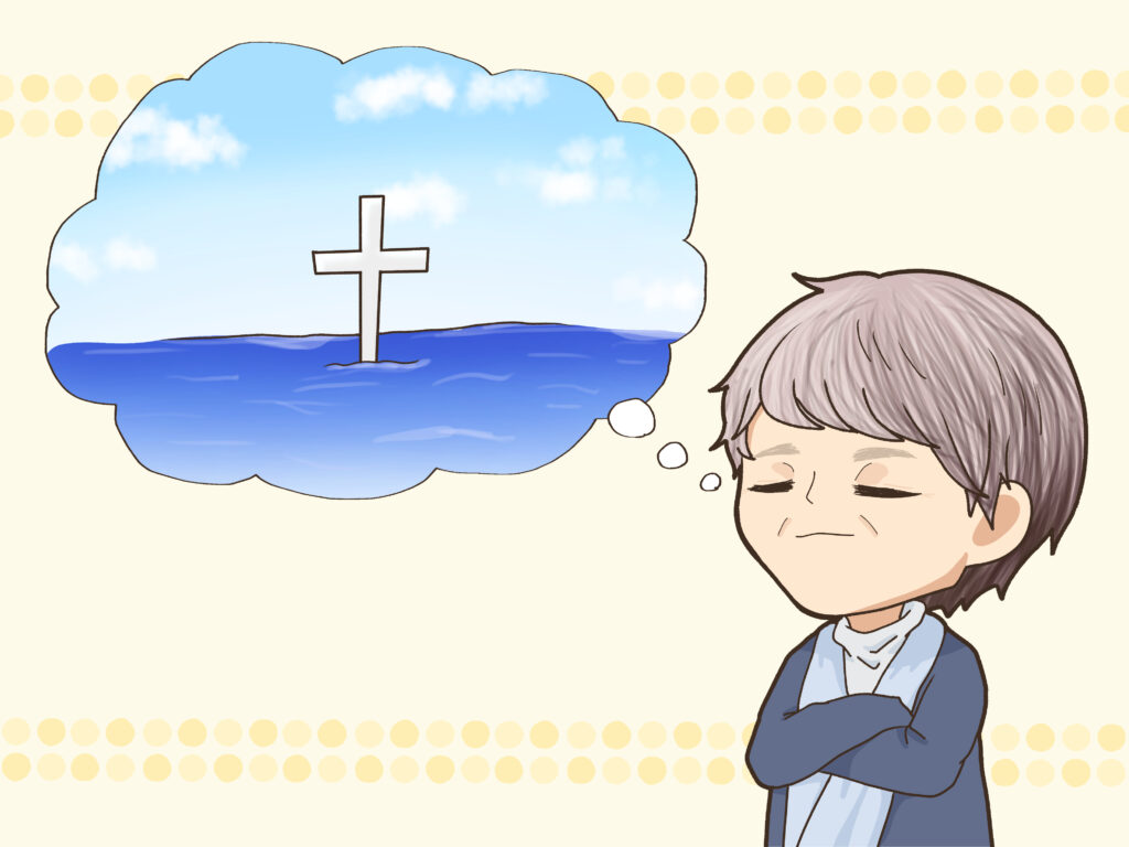 水の上に立つ十字架と森の景色は、ここならではの風景でした